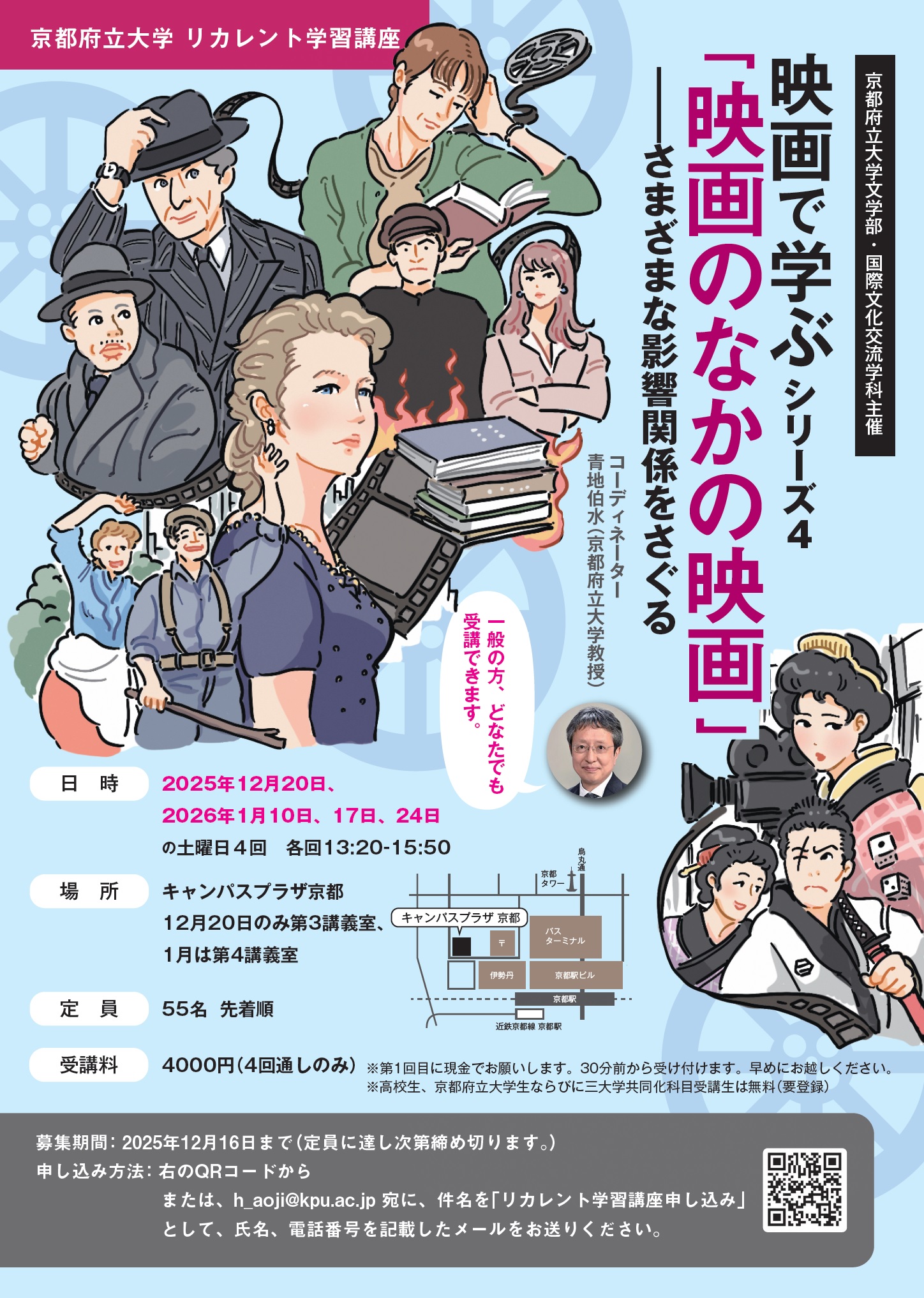 講義は、京都府立大学文学部 青地伯水教授ら4名の講師陣によるリレー講座となっております。日時:2025年12月20日、2026年1月10日、17日、24日の土曜日 各回13:20~15:50