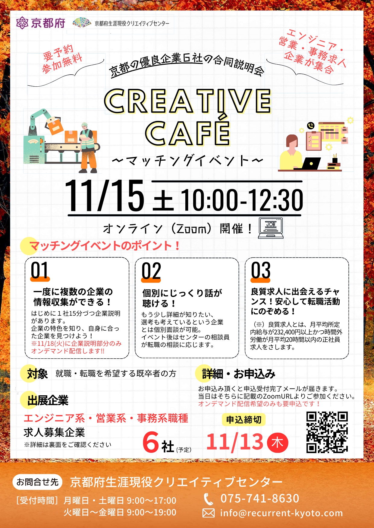 【京都府生涯現役クリエイティブセンター】\11月15日(土)/クリエイティブカフェ~マッチングイベント~開催!(京都府生涯現役クリエイティブセンター)