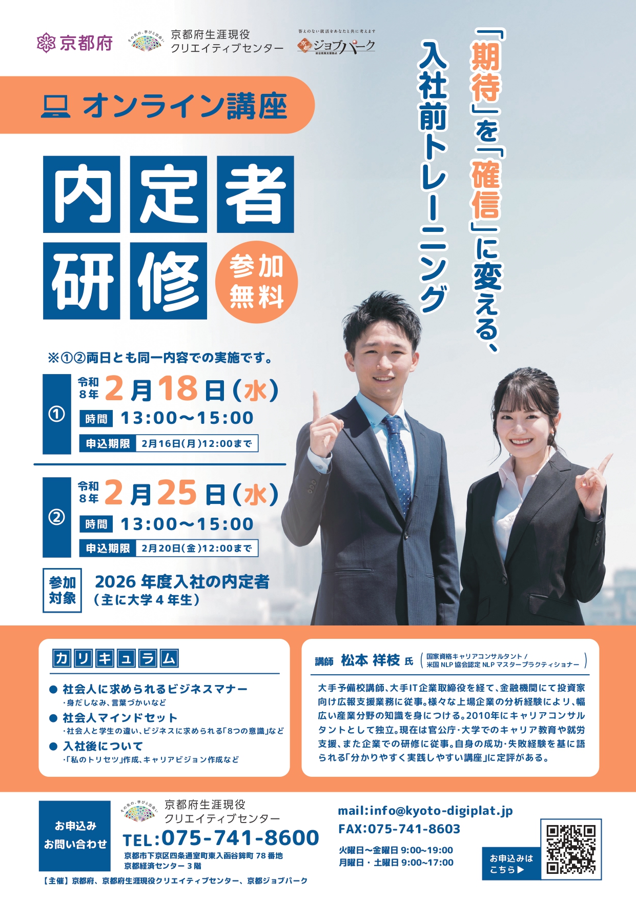 京都府生涯現役クリエイティブセンターでは、4月入社を控える学生の皆さまが、安心して入社日を迎えることができるよう、下記の通り研修を開催いたします。