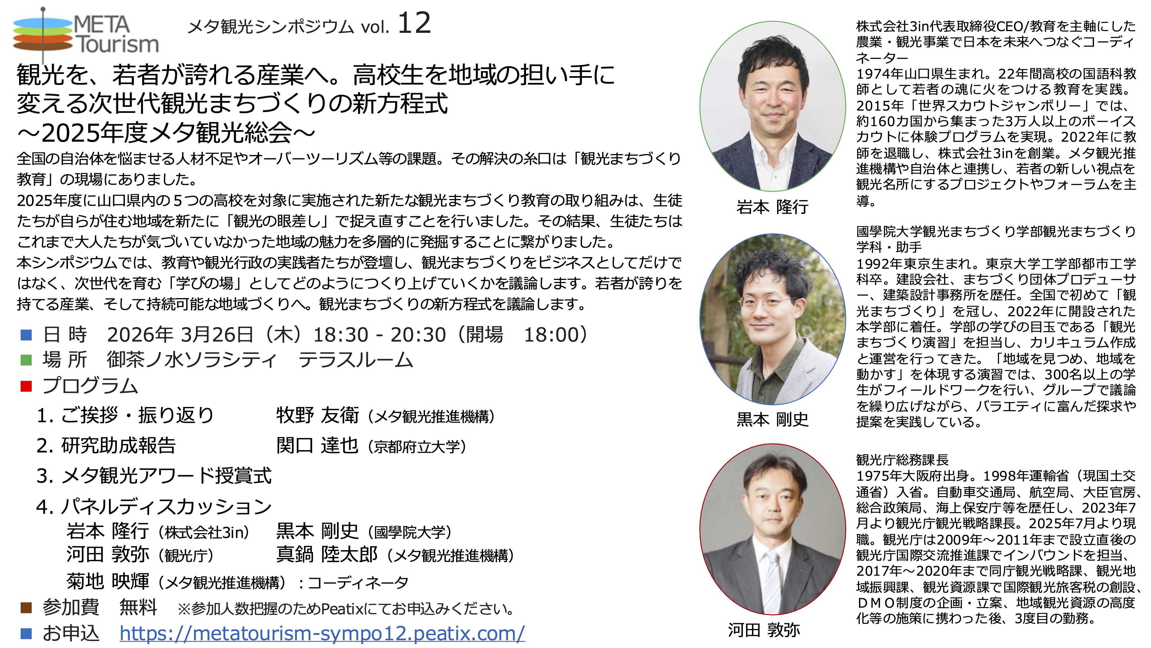 【一般社団法人メタ観光推進機構】メタ観光シンポジウム vol. 12「観光を、若者が誇れる産業へ。高校生を地域の担い手に変える次世代観光まちづくりの新方程式〜2025年度メタ観光総会〜」